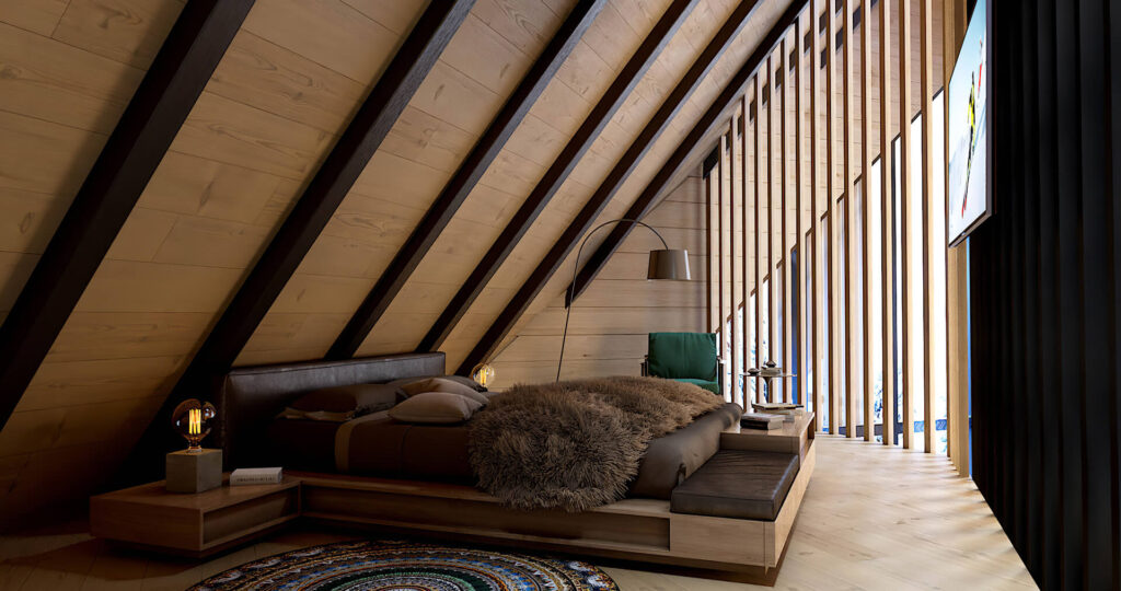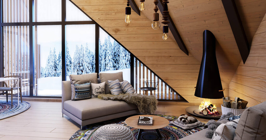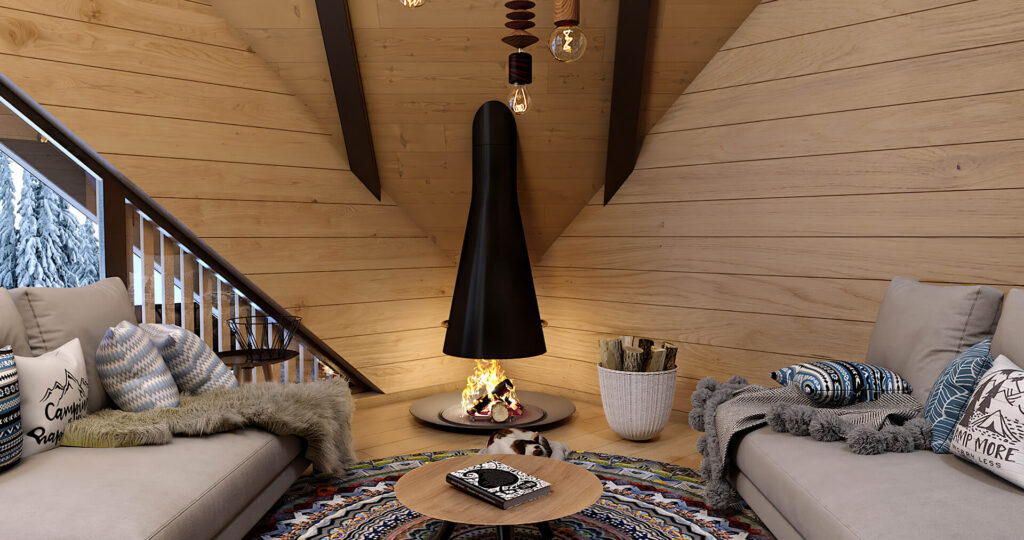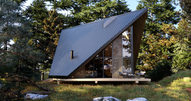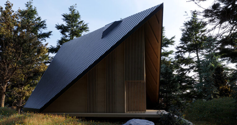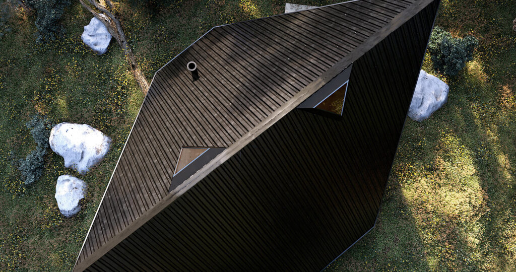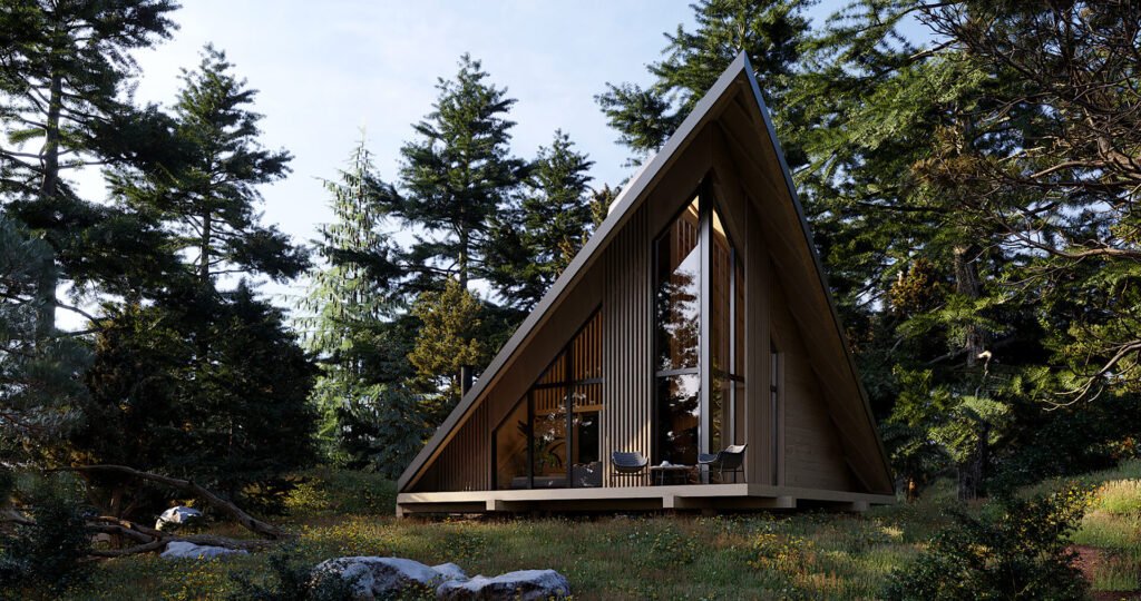 The prefabricated wooden house Jahorina is designed as an “A Frame” house with a sloping roof down to the floor, a square plinth and a perimeter terrace. The facade of the building is covered with wooden cladding on one side, while the other corner side is completely open.