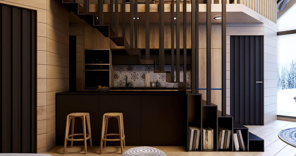 The ground floor facilities are developed diagonally. The central elements of orientation and organization are the kitchen and the steel staircase connecting the ground floor and the gallery.