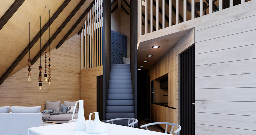 The internal structure of the house is designed so that the ground floor contains a living room with a fireplace, a kitchen and dining room, a laundry room, a rainwater collector, a toilet and an entrance, while sleeping is provided on a completely open gallery.