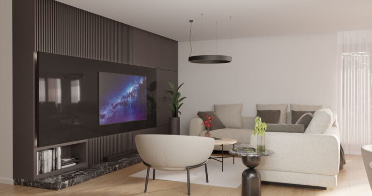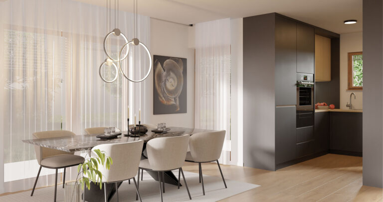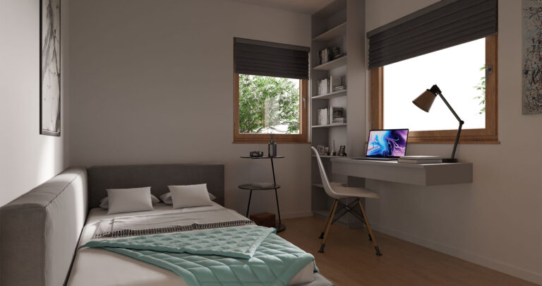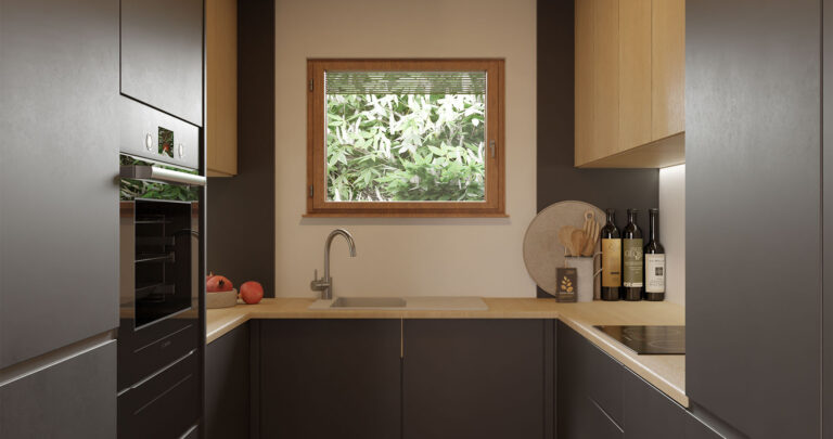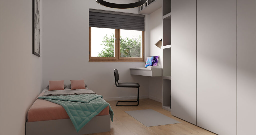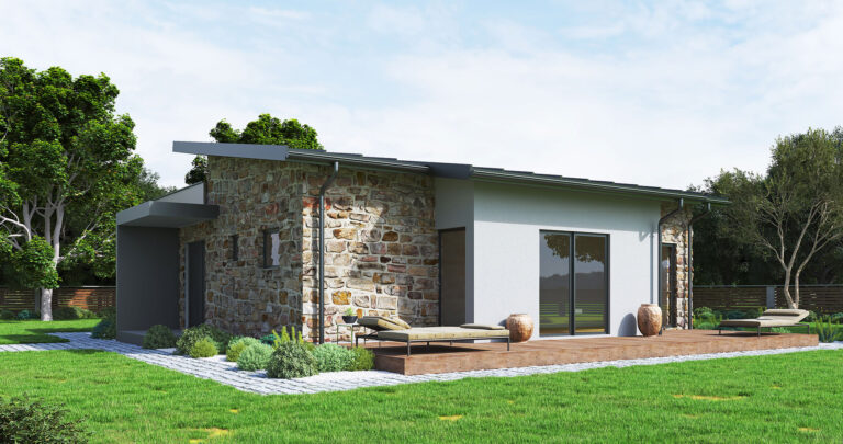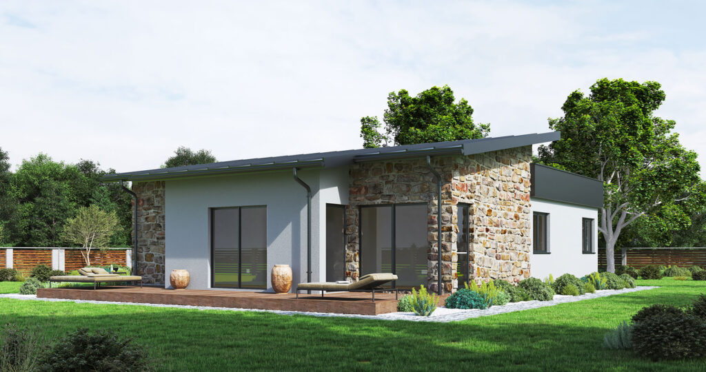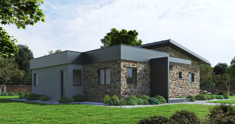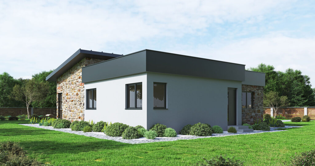 The prefabricated house Korčula is a single-storey house with a total net area of ​​104.96m2. The house consists of three spacious bedrooms, a large open space living room with kitchen and dining room with a total area of ​​43.5m2, as well as a hallway, bathroom, toilet and storage room.